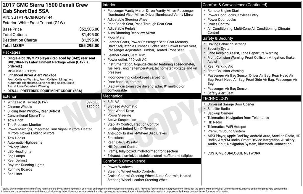 Elevate your driving experience with this stunning 2017 GMC Sierra 1500 Denali. Exuding power, sophistication, and uncompromising capability, this top-of-the-line model is the epitome of premium truck ownership.- White Frost Tricoat exterior with 20 chrome wheels- EcoTec3 5.3L V8 engine with 8-speed automatic transmission and RWD- Impressive fuel efficiency, achieving 16 MPG in the city and 22 MPG on the highwayThis Sierra Denali boasts an impressive array of features that cater to your every need:- Bose premium audio system- Heated and ventilated front seats- Wireless charging- Adaptive suspension with MagneRide technology- Rear vision camera with Rear Park Assist- Enhanced Driver Alert Package with Forward Collision Alert and Lane Keep AssistStep inside and experience the unparalleled comfort and convenience of the Denali's luxurious cabin. Sink into the perforated leather-appointed seats and take in the stunning, customizable 8 driver display. The dual-zone automatic climate control and heated steering wheel ensure you and your passengers enjoy a tailored driving environment.With the Sierra Denali's impressive towing and payload capabilities, you can confidently tackle any job or adventure. The 4-wheel disc brakes with ABS and the Trailering Equipment package provide the confidence and control you need, whether hauling heavy loads or navigating the open road.This exceptional 2017 GMC Sierra 1500 Denali is a true testament to GMC's commitment to excellence. Experience the pinnacle of truck luxury and capability. Visit our showroom today and let us demonstrate how this remarkable vehicle can elevate your driving experience.