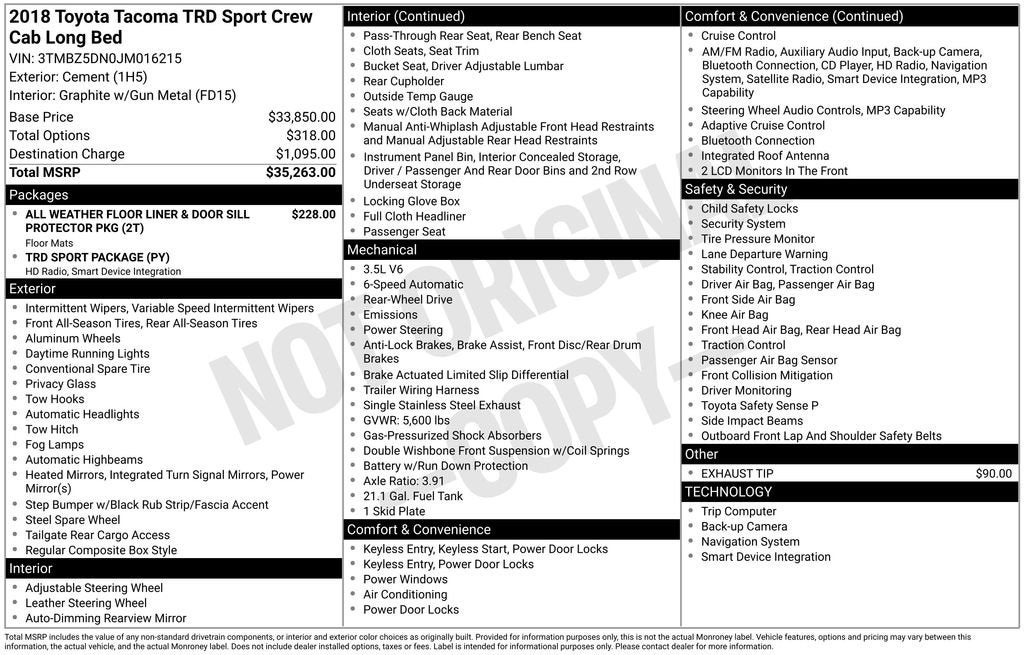 When it comes to safety, this Tacoma TRD Sport has you covered. Dual front and side impact airbags, an engine immobilizer, and a rear-view camera provide peace of mind, while the wide-angle front fog lights and smart key with push-button start add an extra layer of convenience.